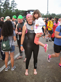The walk to the swim start was not bad. Probably the most frustrating part of that was listening to non-racers complain about the walk and wonder why they were not running a bus shuttle. I really wanted to tell them to be quiet but I didn't. I just walked a little faster to get away from them. I got to transition just as they were singing the "National Anthem." I still needed to drop my special needs bags and get into my wetsuit. I was not nervous. After dropping my special needs bags I texted Jenna to see where they were. As I was walking over to them I saw my friends, Tonia and Fred, and stopped to talk with them. Jenna and Chris joined us. I started eating my yogurt and banana and checked my phone to see where my husband was. We found each other before the start. I got my wet suit on, and lined up with the other wetsuit swimmers. I realized during my training I had never swam 2.4 miles. Oh well, can't change that now.